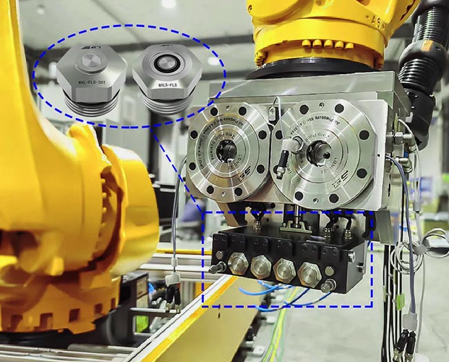 Kombinationseffekt: Der gesamte Austauschprozess wird automatisiert. Roboter oder Aktoren müssen das Werkzeugmodul lediglich an den Nullpunkt-Lokator „anschnallen“, wodurch die präzise Positionierung und starke Verriegelung automatisch erfolgt. Gleichzeitig schließen die leckagefreien Anschlüsse auf beiden Seiten das Andocken automatisch und zuverlässig ab und liefern sofort Strom (Flüssigkeit) und Steuersignale für das Werkzeug. Beim Trennen ist die Reihenfolge umgekehrt: Trennen Sie zuerst den Stecker (geschlossen ohne Leckage) und entriegeln Sie dann den Sucher.