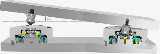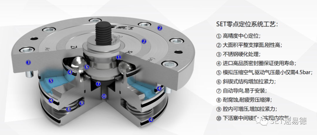 Ein weiteres Merkmal des Nullpunktsystems ist die doppelte Funktion: Positionierung und Klemmung werden gleichzeitig mit einer Genauigkeit von weniger als 5 μs durchgeführt. Der kurze konische Positionierungsstift macht die Kontaktoberfläche vollständig geschlossen und hat die Funktion des Selbstversperrens. Die Positionierungsklemme ermöglicht eine bestimmte radiale Abweichung und Winkelabweichung, die bestimmte Vorteile für die automatische oder manuelle Belastung und Entladung hat.