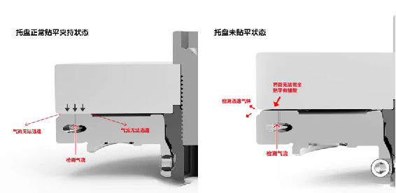 Um die Stabilität des Tabletts zu gewährleisten und die Positionierungsanforderungen zu erfüllen, sollte der Null -Positionier ein Klemmerkennungsgerät hinzufügen. Der Zweck dieses Geräts besteht darin, sicherzustellen, dass der Null -Positionier die Positionierungsfläche des Faches vollständig kontaktieren kann, und es gibt keinen Eisenschnitt oder andere Trümmer in der Mitte. Sein Arbeitsprinzip ist in Abbildung (1) dargestellt. Die Erkennungsluft füllt den Luftdruck außerhalb des Lochs (0,2 mPa) frei. Stellen Sie den Bewertungswert des Durchflusssensors ein. Wenn das Tablett nicht flach mit dem Positionierer ist, wie in Abbildung 2 gezeigt, entweichen das nachgewiesene entkommende Gas entlang des Spaltes nach außen, und der Durchflusssensor bestimmt den Flussdifferenz, um die Klemmerkennung zu realisieren. Das Erkennungsloch sprüht auch 0,6 MPa -Reinigungsdruck nach außen, um die Stoma -Reinigung zu gewährleisten. Mehrere Locators können gleichzeitig erkannt werden, wodurch die Kosten gesenkt werden. 2. Sobald es in mehreren Positionierern einen Leckflusswert gibt, steht er mit dem voreingestellten Flusswert nicht überein, sodass er sicherer ist. 3. Die Erkennungsmethode ist direkter, das Tablett ist nicht geladen und der leere Stellverschluss kann erkannt werden.