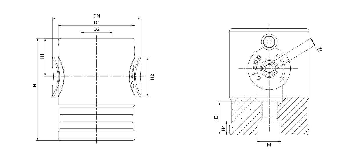 | Dimensionszahl | Dn | D1 | ØD2 | H (± 0,01) | H1 | H2 | H3 | H4 | W | M (H7) |